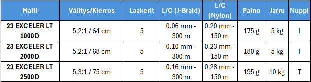 - Kelamallien merkinnät: D (Deep spool) -mallit syvemmällä puolalla, C-kompakti runkokoko.