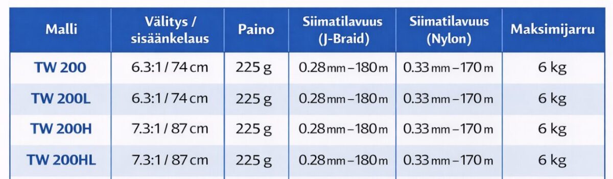 Daiwan 25 TATULA TW 200 on uusi baitcasting-kela, joka yhdistää Hyperdrive Design -konseptin, T-Wing Systemin (TWS) ja Magforce-jarrun tarjoamaan voimaa, kestävyyttä ja sulavaa kelauksen hallintaa. Suuri 38 mm puola mahdollistaa paljon siimaa, ja iso kampi korkean otteen nuppien kanssa tuo maksimaalisen väännön ja hallinnan.