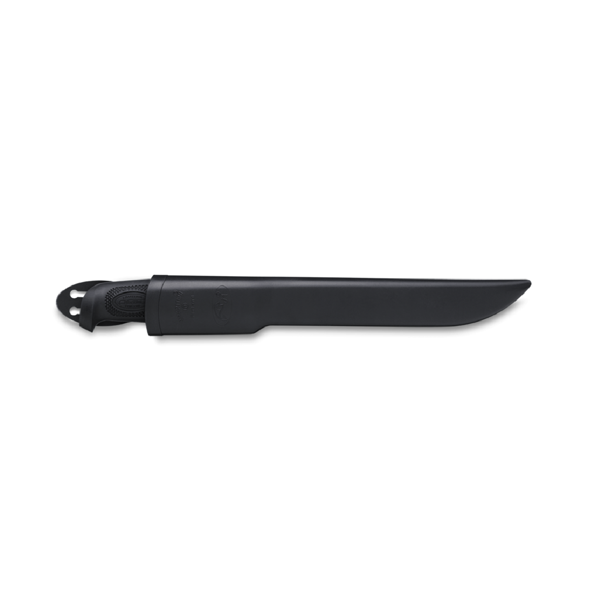 Mukana toimitettava kestävä muovituppi suojaa terää ja helpottaa turvallista säilytystä, sekä kuljetusta muiden kalastusvälineiden joukossa.