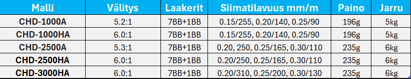 Okuma Ceymar HD jatkaa suosittua sarjaa tarjoten suorituskykyä niin saltti- kuin makeanveden kalastukseenkin. Tässä haspelikelassa on ylisuuri koneisto, joka takaa enemmän voimaa ja kestävyyttä. Värähtelemättömän koneiston ansiosta kela toimii pehmeästi ja luotettavasti. Ceymar HD:ssa on alumiininen koneiston kylkeen ruuvattava kampi, joka on suorassa kontaktissa koneistoon. Tämä vähentää kammen väljyyttä ja parantaa näin kokonaistuntumaa esimerkiksi nopeissa vapauitoissa.