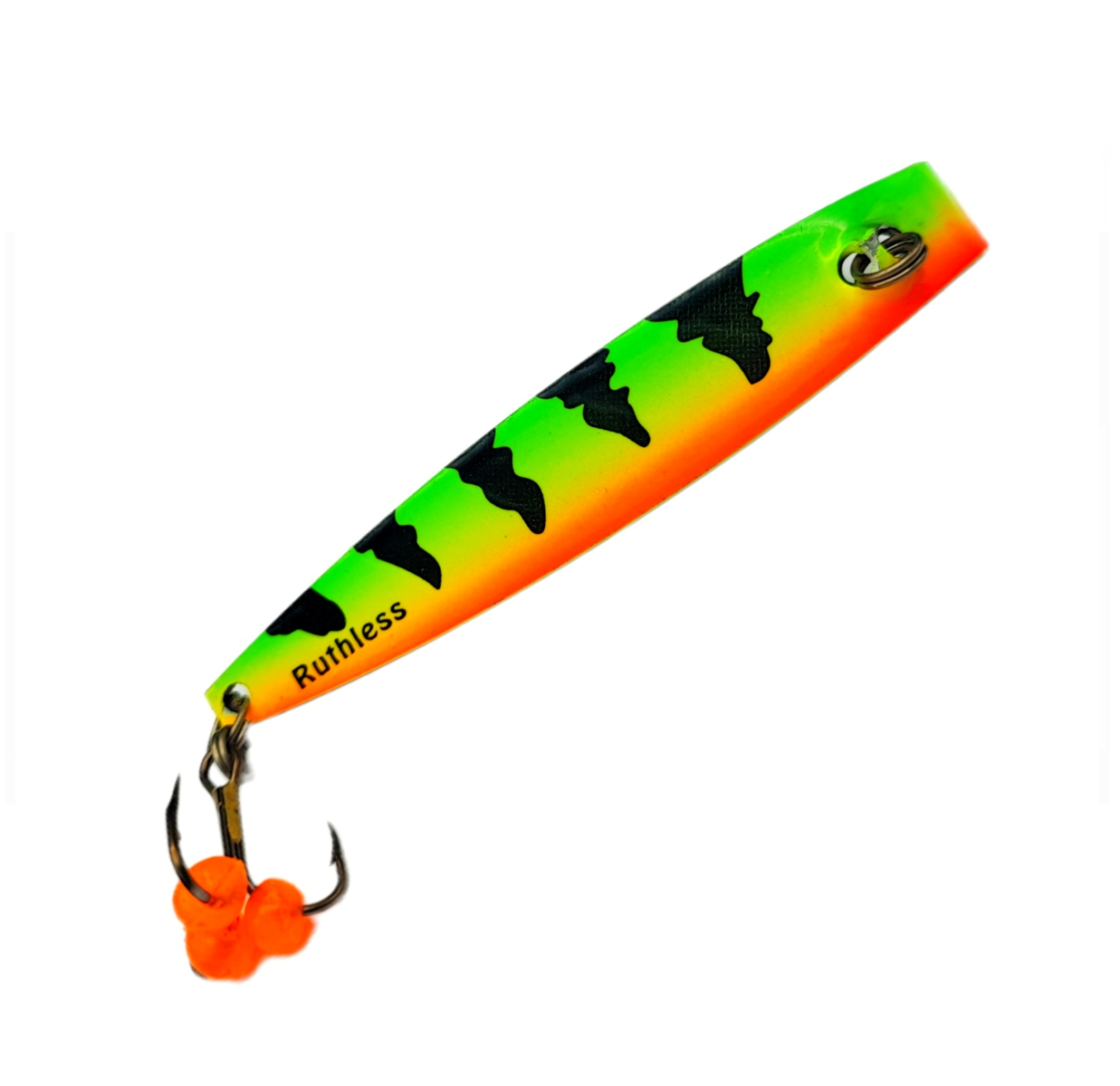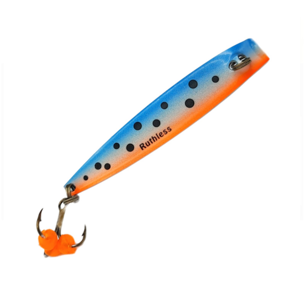 Ruthless Pystypilkit valmistetaan ja maalataan käsityönä Euroopassa. Ruthless Pystypilkki 85 mm on Ruthless Fishingin Teamin mestaripilkkijä Juuso Kuuselan suunnittelema pilkkimalli ahvenen, kuhan ja kirjolohen kalastukseen. Vieheen pyyntitehokkuus perustuu pilkin epäsymmetriseen ja ennalta arvaamattomaan uintiliikkeeseen. Ruthless Pystypilkin vetopiste sijaitsee poikkeuksellisesti vieheen rungon keskiosassa. Pystypilkkiä uitettaessa viehe ”hakee” voimakkaasti puolelta toiselle vetopisteen sijainnista johtuen. Pilkin koveran rungon ja kiilamaisen muotoilun ansiosta se vajoaa pudotessaan vaakatasossa välkyttäen kylkiään vastustamattomasti. Ruthless Pystypilkin kolmihaarakoukkuun on kiinnitetty kalastustehokkuuden maksimoimiseksi Orka Fish Roe mätipalloja, jotka luovat koukkuun räikeän iskupisteen. Katso kuva alta: