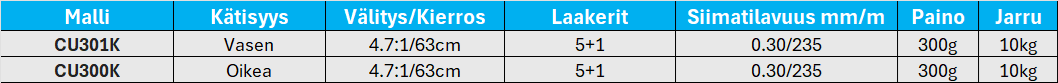 Shimano Curado 300/301 on osa legendaarista Curado-tuoteperhettä, joka on tunnettu erinomaisesta hinta-laatusuhteestaan ja luotettavuudestaan. Suurikokoinen 300/301-malli on suunniteltu erityisesti isoille vieheille ja voimakasta kelausta vaativaan kalastukseen – kuten hauen kalastukseen.